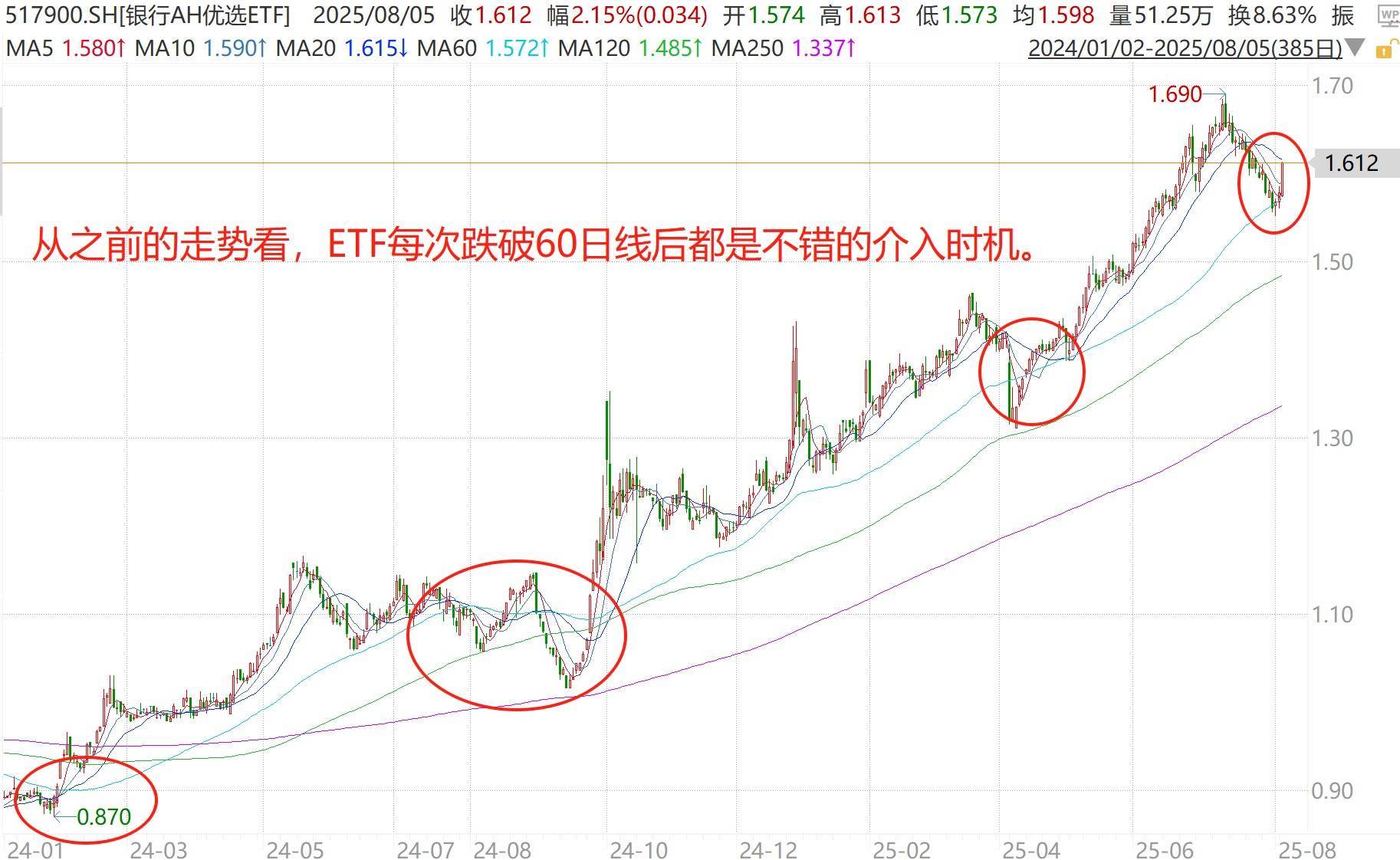 之前银行AH优选ETF(517900)踩到60日线,就已经声明可能是机会。当时市场一片迷茫,银行股连跌,不少人嘀咕“大象是不是跑不动了”。