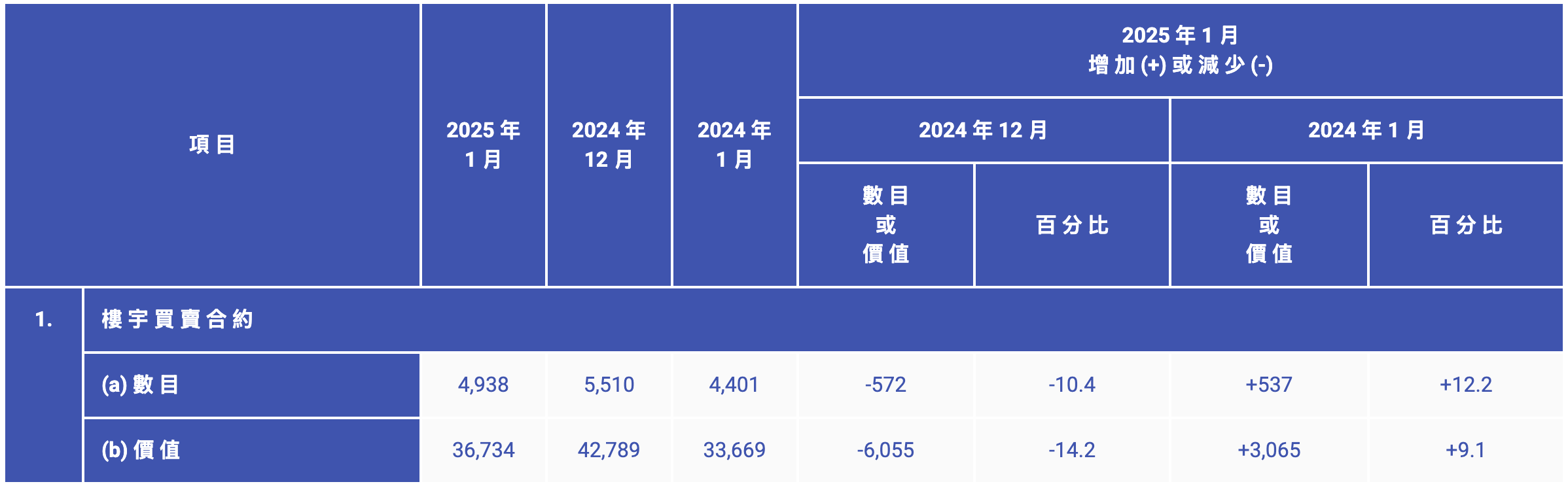 根据香港特别行政区政府土地注册处统计数据,今年1月,香港楼宇买卖合约登记(包括住宅、车位及工商铺物业)录得4938宗,总值367.34亿港元,较2024年12月的5510宗、427.89亿港元分别下降10.4%、14.2%。