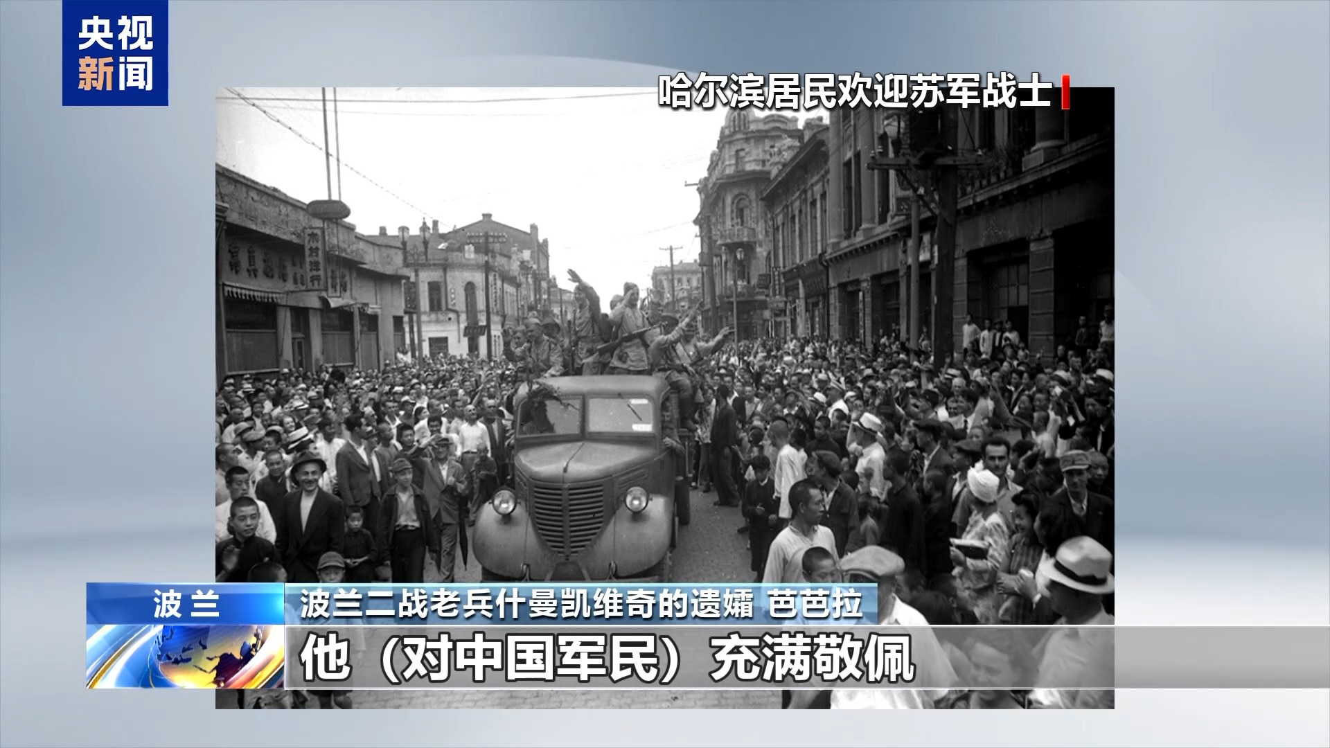 波兰二战老兵什曼凯维奇的遗孀 芭芭拉:他对中国军民充满敬佩,虽然民众生活困苦,但他钦佩这种凝聚力,很难用言语表达。他对中国人民的品格赞不绝口,用他的话说,这是个真正非凡的民族,能在困境中自强不息。他始终对中国和中国人民充满敬意。他把中国当作第二故乡,这份情感伴随终生。