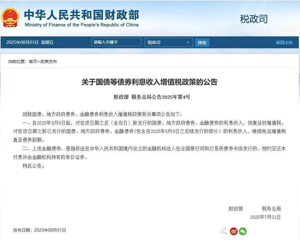 自2025年8月8日起,对在该日期之后(含当日)新发行的国债、地方政府债券、金融债券的利息收入,恢复征收增值税。8月8日之前的债券的利息收入,继续免征增值税直至债券到期。