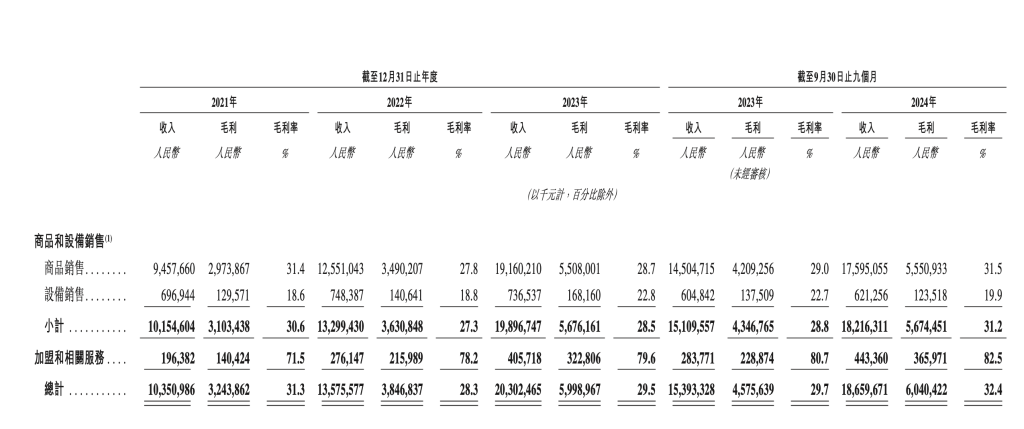 以2024年前三季度为例,商品和设备销售为182.16亿元,加盟和相关服务营收为4.43亿元。